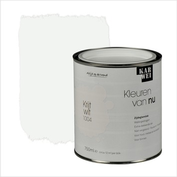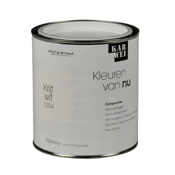 De KARWEI Kleuren van Nu lak zijdeglans krijtwit 750 ml maakt onderdeel uit van een uitgebreid actueel kleurenpallet volgens de laatste trends. De zijdeglanzende lak behoudt zijn kleur, ook in donkere ruimtes. De lak op waterbasis droogt snel en is reukarm. De lak is krasvast en is met name bedoeld voor gebruik binnenshuis. Het is geschikt voor zowel deuren als kozijnen, maar je kunt het ook gebruiken op meubelen of voor andere decoratieve toepassingen. Het blik bevat 750 milliliter krijtwitte lak, dit is genoeg voor een oppervlakte van 12 vierkante meter. Door de optimale dekking en vloeiing van de lak bereik je snel het gewenste resultaat. De lak kan eenvoudig worden aangebracht met een kwast of roller.