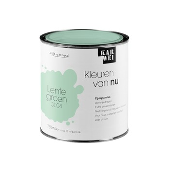 De KARWEI Kleuren van Nu lak zijdeglans lentegroen 750 ml maakt onderdeel uit van een uitgebreid actueel kleurenpallet volgens de laatste trends. De zijdeglanzende lak behoudt zijn kleur, ook in donkere ruimtes. De lak op waterbasis droogt snel en is reukarm. De lak is krasvast en is met name bedoeld voor gebruik binnenshuis. Het is geschikt voor zowel deuren als kozijnen, maar je kunt het ook gebruiken op meubelen of voor andere decoratieve toepassingen. Het blik bevat 750 milliliter lentegroene lak, dit is genoeg voor een oppervlakte van 12 vierkante meter. Door de optimale dekking en vloeiing van de lak bereik je snel het gewenste resultaat. De lak kan eenvoudig worden aangebracht met een kwast of roller.