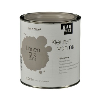 De KARWEI Kleuren van Nu lak zijdeglans linnengrijs 750 ml maakt onderdeel uit van een uitgebreid actueel kleurenpallet volgens de laatste trends. De zijdeglanzende lak behoudt zijn kleur, ook in donkere ruimtes. De lak op waterbasis droogt snel en is reukarm. De lak is krasvast en is met name bedoeld voor gebruik binnenshuis. Het is geschikt voor zowel deuren als kozijnen, maar je kunt het ook gebruiken op meubelen of voor andere decoratieve toepassingen. Het blik bevat 750 milliliter linnengrijze lak, dit is genoeg voor een oppervlakte van 12 vierkante meter. Door de optimale dekking en vloeiing van de lak bereik je snel het gewenste resultaat. De lak kan eenvoudig worden aangebracht met een kwast of roller.