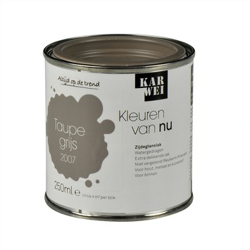 De KARWEI Kleuren van Nu lak zijdeglans taupe grijze 250 ml maakt onderdeel uit van een uitgebreid actueel kleurenpallet volgens de laatste trends. De zijdeglanzende lak behoudt zijn kleur, ook in donkere ruimtes. De lak op waterbasis droogt snel en is reukarm. De lak is krasvast en is met name bedoeld voor gebruik binnenshuis. Het is geschikt voor zowel deuren als kozijnen, maar je kunt het ook gebruiken op meubelen of voor andere decoratieve toepassingen. Het blik bevat 250 milliliter taupegrijze lak, dit is genoeg voor een oppervlakte van 4 vierkante meter. Door de optimale dekking en vloeiing van de lak bereik je snel het gewenste resultaat. De lak kan eenvoudig worden aangebracht met een kwast of roller.