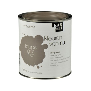 De KARWEI Kleuren van Nu lak zijdeglans taupe grijze 750 ml maakt onderdeel uit van een uitgebreid actueel kleurenpallet volgens de laatste trends. De zijdeglanzende lak behoudt zijn kleur, ook in donkere ruimtes. De lak op waterbasis droogt snel en is reukarm. De lak is krasvast en is met name bedoeld voor gebruik binnenshuis. Het is geschikt voor zowel deuren als kozijnen, maar je kunt het ook gebruiken op meubelen of voor andere decoratieve toepassingen. Het blik bevat 750 milliliter taupegrijze lak, dit is genoeg voor een oppervlakte van 12 vierkante meter. Door de optimale dekking en vloeiing van de lak bereik je snel het gewenste resultaat. De lak kan eenvoudig worden aangebracht met een kwast of roller.