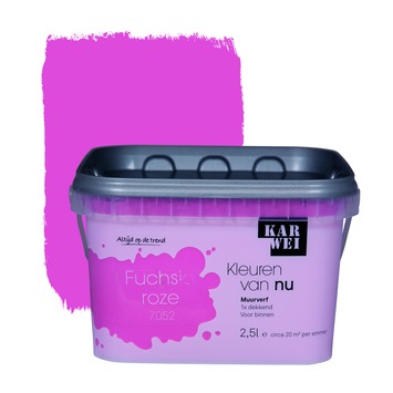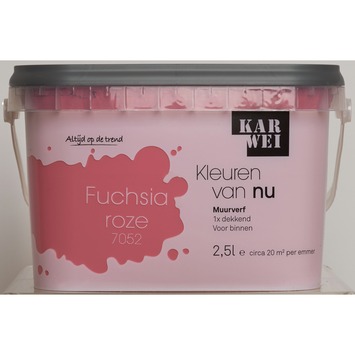 De KARWEI Kleuren van Nu muurverf mat fuchsiaroze 2,5 l maakt onderdeel uit van een uitgebreid actueel kleurenpallet volgens de laatste trends. De dekkende muurverf heeft een matte uitstraling en is afwasbaar. De verf is geschikt voor toepassing in droge ruimtes binnenshuis. De emmer bevat 2,5 liter muurverf in de kleur fuchsiaroze, dit is genoeg voor een oppervlakte van zo'n 20 vierkante meter. De muurverf kan eenvoudig worden aangebracht met een vachtroller. Met deze muurverf breng je trendy accenten aan in woonkamer, hal of slaapkamer.