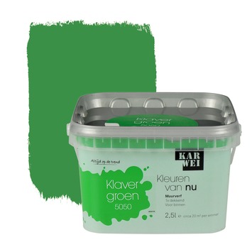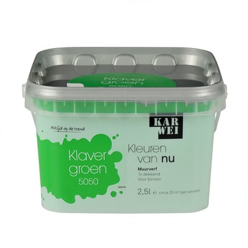 De KARWEI Kleuren van Nu muurverf mat klavergroen 2,5 l maakt onderdeel uit van een uitgebreid actueel kleurenpallet volgens de laatste trends. De dekkende muurverf heeft een matte uitstraling en is afwasbaar. De verf is geschikt voor toepassing in droge ruimtes binnenshuis. De emmer bevat 2,5 liter muurverf in de kleur klavergroen, dit is genoeg voor een oppervlakte van zo'n 20 vierkante meter. De muurverf kan eenvoudig worden aangebracht met een vachtroller. Met deze muurverf breng je trendy accenten aan in woonkamer, hal of slaapkamer.