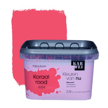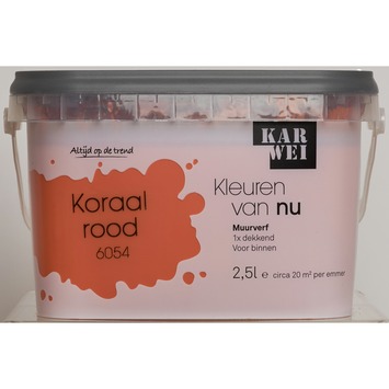 De KARWEI Kleuren van Nu muurverf mat koraalrood 2,5 l maakt onderdeel uit van een uitgebreid actueel kleurenpallet volgens de laatste trends. De dekkende muurverf heeft een matte uitstraling en is afwasbaar. De verf is geschikt voor toepassing in droge ruimtes binnenshuis. De emmer bevat 2,5 liter muurverf in de kleur koraalrood, dit is genoeg voor een oppervlakte van zo'n 20 vierkante meter. De muurverf kan eenvoudig worden aangebracht met een vachtroller. Met deze muurverf breng je trendy accenten aan in woonkamer, hal of slaapkamer.