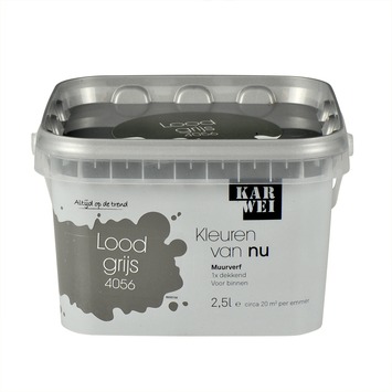 De KARWEI Kleuren van Nu muurverf mat loodgrijs 2,5 l maakt onderdeel uit van een uitgebreid actueel kleurenpallet volgens de laatste trends. De dekkende muurverf heeft een matte uitstraling en is afwasbaar. De verf is geschikt voor toepassing in droge ruimtes binnenshuis. De emmer bevat 2,5 liter muurverf in de kleur loodgrijs, dit is genoeg voor een oppervlakte van zo'n 20 vierkante meter. De muurverf kan eenvoudig worden aangebracht met een vachtroller. Met deze muurverf breng je trendy accenten aan in woonkamer, hal of slaapkamer.