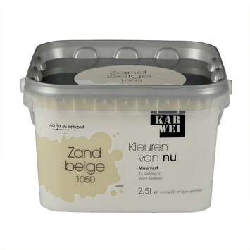 De KARWEI Kleuren van Nu muurverf mat zandbeige 2,5 l maakt onderdeel uit van een uitgebreid actueel kleurenpallet volgens de laatste trends. De dekkende muurverf heeft een matte uitstraling en is afwasbaar. De verf is geschikt voor toepassing in droge ruimtes binnenshuis. De emmer bevat 2,5 liter muurverf in de kleur zandbeige, dit is genoeg voor een oppervlakte van zo'n 20 vierkante meter. De muurverf kan eenvoudig worden aangebracht met een vachtroller. Met deze muurverf breng je trendy accenten aan in woonkamer, hal of slaapkamer.