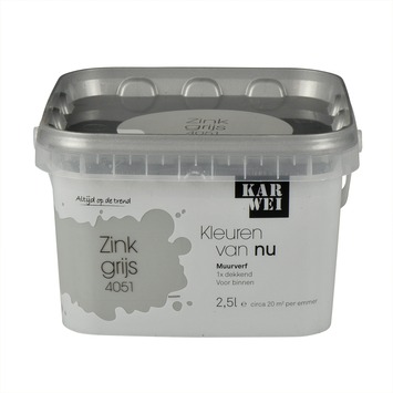 De KARWEI Kleuren van Nu muurverf mat zinkgrijs 2,5 l maakt onderdeel uit van een uitgebreid actueel kleurenpallet volgens de laatste trends. De dekkende muurverf heeft een matte uitstraling en is afwasbaar. De verf is geschikt voor toepassing in droge ruimtes binnenshuis. De emmer bevat 2,5 liter muurverf in de kleur zinkgrijs, dit is genoeg voor een oppervlakte van zo'n 20 vierkante meter. De muurverf kan eenvoudig worden aangebracht met een vachtroller. Met deze muurverf breng je trendy accenten aan in woonkamer, hal of slaapkamer.