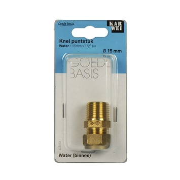 De KARWEI knelfitting puntstuk 15 mm x 1/2 inch buitendraads messing wordt geplaatst als koppeling tussen twee buizen van een gas- of waterleiding. Het puntstuk is een verbindingsstuk met 2 verschillende maten. Een 15 mm aan de ene kant en 1/2 inch aan de andere kant. Een fitting is een onderdeel om twee leidingen aan elkaar te bevestigen. Een knelfitting heeft een waterdichte werking, zodat er rondom de koppeling geen gas of water vrijkomt.