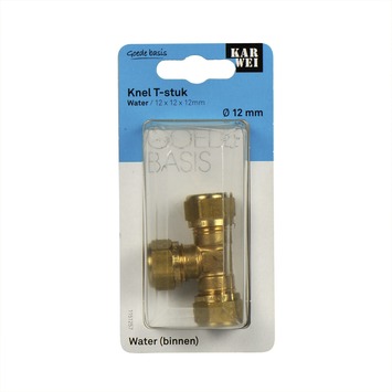 De KARWEI knelfitting t-stuk 12x12x12 mm messing wordt geplaatst als koppeling van één naar twee buizen van een gas- of waterleiding. Een t-stuk is geschikt om vertakkingen te maken in een leidingsysteem. Een fitting is een onderdeel om twee leidingen aan elkaar te bevestigen. Een knelfitting heeft een waterdichte werking, zodat er rondom de koppeling geen gas of water vrijkomt.