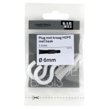 De KARWEI Plug met kraag HDPE Ø 6mm met haak met kraag is voor meerdere materialen te gebruiken De plug is zowel geschikt voor beton, massieve als geperforeerde steen, en ook voor holle wanden. De kop van de plug wordt namelijk door de schroef naar achteren getrokken en vormt in holle bouwmaterialen een soort knoop. Een handige plug dus om op voorraad te hebben, zodat je altijd een geschikte plug in huis hebt. De plug is 36mm lang, voor het beste resultaat adviseren wij een minimale boordiepte te hanteren van 40mm . Een verpakking bevat 2 pluggen met 0 40mm