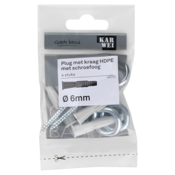 De KARWEI Plug met kraag HDPE Ø 6mm met schroefoog met kraag is voor meerdere materialen te gebruiken De plug is zowel geschikt voor beton, massieve als geperforeerde steen, en ook voor holle wanden. De kop van de plug wordt namelijk door de schroef naar achteren getrokken en vormt in holle bouwmaterialen een soort knoop. Een handige plug dus om op voorraad te hebben, zodat je altijd een geschikte plug in huis hebt. De plug is 36mm lang, voor het beste resultaat adviseren wij een minimale boordiepte te hanteren van 40mm . Een verpakking bevat 4 pluggen met 0 40mm