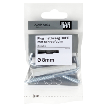 De KARWEI Plug met kraag HDPE Ø 8mm met schroefduim is voor meerdere materialen te gebruiken De plug is zowel geschikt voor beton, massieve als geperforeerde steen, en ook voor holle wanden. De kop van de plug wordt namelijk door de schroef naar achteren getrokken en vormt in holle bouwmaterialen een soort knoop. Een handige plug dus om op voorraad te hebben, zodat je altijd een geschikte plug in huis hebt. De plug is 50mm lang, voor het beste resultaat adviseren wij een minimale boordiepte te hanteren van 55mm . Een verpakking bevat 2 pluggen met 0 55mm