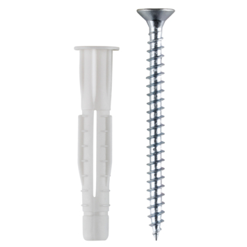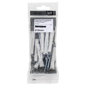 De KARWEI Plug met kraag HDPE Ø 8mm met schroef is voor meerdere materialen te gebruiken De plug is zowel geschikt voor beton, massieve als geperforeerde steen, en ook voor holle wanden. De kop van de plug wordt namelijk door de schroef naar achteren getrokken en vormt in holle bouwmaterialen een soort knoop. Een handige plug dus om op voorraad te hebben, zodat je altijd een geschikte plug in huis hebt. De plug is 50mm lang, voor het beste resultaat adviseren wij een minimale boordiepte te hanteren van 55mm . Een verpakking bevat 8 pluggen met 0 55mm