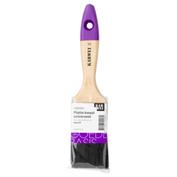 De KARWEI kwast universeel plat maat 50 is een platte kwast die je kunt gebruiken voor verf op waterbasis en terpentinebasis. Met een breedte van 5 centimeter is deze kwast geschikt voor middelgrote oppervlakken zoals deuren of schuttingen. Je gebruikt de kwast op gladde of ruwe ondergronden van hout, metaal of kunststof. De haren zijn van synthetisch materiaal wat handig is bij watergedragen verf omdat ze de verf goed vasthouden en gelijkmatig afgeven. Het handvat is van hout wat stevig in de hand ligt maar minder goed tegen vocht kan. Je gebruikt deze kwast voor lak muurverf en beits.