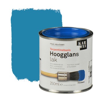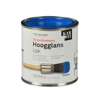 De KARWEI lak hoogglans fris blauw extra dekkend 250 ml is een stoot- en krasvaste lak. Het is geschikt voor decoratieve toepassingen binnenshuis op zowel hout, metaal als kunststof. De lak is ook weersbestendig en dus te gebruiken voor toepassingen buitenshuis. De lak op terpentinebasis heeft een optimale vloeiing en is hierdoor gemakkelijk en snel aan te brengen met een kwast of roller, ook is de lak extra dekkend. Het blik bevat 250 milliliter fris blauwe lak, dit is genoeg voor een oppervlakte van zo'n 4 vierkante meter, ervan uitgaande dat in dunne lagen wordt geschilderd. De hoogglans lak is in diverse populaire kleuren kant en klaar verkrijgbaar. Zit jou kleur er toch niet bij, dan kun je deze laten mengen in de KARWEI bouwmarkt op de verfmengmachine. Let erop dat lichte kleuren binnenshuis naar verloop van tijd geel kunnen worden, vooral op plaatsen die niet veel in contact komen met daglicht.