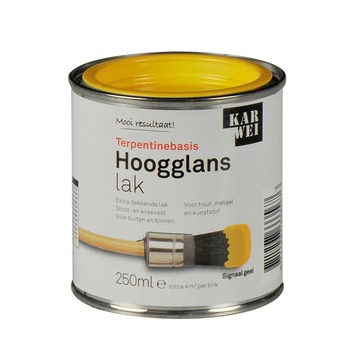 De KARWEI lak hoogglans signaalgeel extra dekkend 250 ml is een stoot- en krasvaste lak. Het is geschikt voor decoratieve toepassingen binnenshuis op zowel hout, metaal als kunststof. De lak is ook weersbestendig en dus te gebruiken voor toepassingen buitenshuis. De lak op terpentinebasis heeft een optimale vloeiing en is hierdoor gemakkelijk en snel aan te brengen met een kwast of roller, ook is de lak extra dekkend. Het blik bevat 250 milliliter signaal gele lak, dit is genoeg voor een oppervlakte van zo'n 4 vierkante meter, ervan uitgaande dat in dunne lagen wordt geschilderd. De hoogglans lak is in diverse populaire kleuren kant en klaar verkrijgbaar. Zit jou kleur er toch niet bij, dan kun je deze laten mengen in de KARWEI bouwmarkt op de verfmengmachine. Let erop dat lichte kleuren binnenshuis naar verloop van tijd geel kunnen worden, vooral op plaatsen die niet veel in contact komen met daglicht.