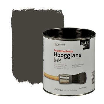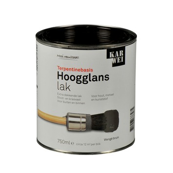 De KARWEI lak hoogglans wengé bruin extra dekkend 750 ml is een stoot- en krasvaste lak. Het is geschikt voor decoratieve toepassingen binnenshuis op zowel hout, metaal als kunststof. De lak is ook weersbestendig en dus te gebruiken voor toepassingen buitenshuis. De lak op terpentinebasis is gemakkelijk en snel aan te brengen met een kwast of roller en is extra dekkend. Het blik bevat 750 milliliter wengé bruine lak, dit is genoeg voor een oppervlakte van zo'n 12 vierkante meter, ervan uitgaande dat in dunne lagen wordt geschilderd. De hoogglans lak is in diverse populaire kleuren kant en klaar verkrijgbaar. Zit jou kleur er toch niet bij, dan kun je deze laten mengen in de KARWEI bouwmarkt op de verfmengmachine. Let erop dat lichte kleuren binnenshuis naar verloop van tijd geel kunnen worden, vooral op plaatsen die niet veel in contact komen met daglicht.
