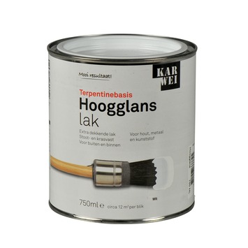 De KARWEI lak hoogglans wit extra dekkend 750 ml is een stoot- en krasvaste lak. Het is geschikt voor decoratieve toepassingen binnenshuis op zowel hout, metaal als kunststof. De lak is ook weersbestendig en dus te gebruiken voor toepassingen buitenshuis. De lak op terpentinebasis is gemakkelijk en snel aan te brengen met een kwast of roller en is extra dekkend. Het blik bevat 750 milliliter witte lak, dit is genoeg voor een oppervlakte van zo'n 12 vierkante meter, ervan uitgaande dat in dunne lagen wordt geschilderd. De hoogglans lak is in diverse populaire kleuren kant en klaar verkrijgbaar. Zit jou kleur er toch niet bij, dan kun je deze laten mengen in de KARWEI bouwmarkt op de verfmengmachine. Let erop dat lichte kleuren binnenshuis naar verloop van tijd geel kunnen worden, vooral op plaatsen die niet veel in contact komen met daglicht.