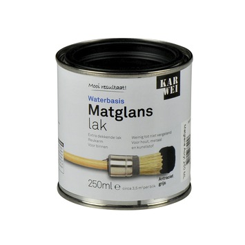 De KARWEI lak waterbasis matglans wengé bruin extra dekkend 250 ml is een krasvaste lak. De lak heeft een mooie matte uitstraling en behoudt zijn kleur, ook in donkere ruimtes. Deze lak op waterbasis droogt snel en is reukarm. De lak is geschikt voor gebruik binnenshuis, bijvoorbeeld voor je deuren en kozijnen. Je kunt de lak echter ook gebruiken voor meubelen en andere decoratieve toepassingen. De matte lak heeft een optimale dekking en vloeiing. Hierdoor kun je de lak gemakkelijk met een kwast of roller aanbrengen. Het blik bevat 250 milliliter wengé bruine lak, dit is genoeg voor zo'n 3,5 vierkante meter. Bij voorkeur breng je de lak in dikkere lagen aan. De matglans lak is in diverse populaire kleuren kant en klaar verkrijgbaar. Zit jou kleur er toch niet bij, dan kun je deze laten mengen in de KARWEI bouwmarkt op de verfmengmachine.