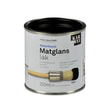De KARWEI lak waterbasis matglans zwart extra dekkend 250 ml is een krasvaste lak. De lak heeft een mooie matte uitstraling en behoudt zijn kleur, ook in donkere ruimtes. Deze lak op waterbasis droogt snel en is reukarm. De lak is geschikt voor gebruik binnenshuis, bijvoorbeeld voor je deuren en kozijnen. Je kunt de lak echter ook gebruiken voor meubelen en andere decoratieve toepassingen. De matte lak heeft een optimale dekking en vloeiing. Hierdoor kun je de lak gemakkelijk met een kwast of roller aanbrengen. Het blik bevat 250 milliliter zwarte lak, dit is genoeg voor zo'n 3,5 vierkante meter. Bij voorkeur breng je de lak in dikkere lagen aan. De matglans lak is in diverse populaire kleuren kant en klaar verkrijgbaar. Zit jou kleur er toch niet bij, dan kun je deze laten mengen in de KARWEI bouwmarkt op de verfmengmachine.