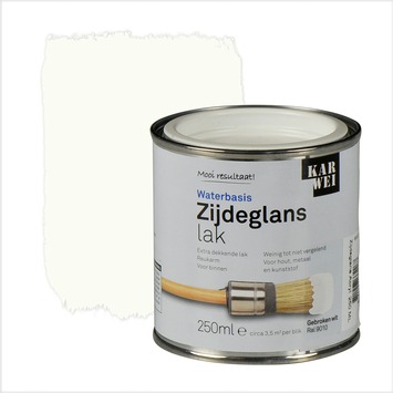 De KARWEI lak waterbasis zijdeglans gebroken wit extra dekkend 250 ml is een extra dekkende, krasvaste lak. De lak is geschikt voor gebruik binnenshuis, voor bijvoorbeeld deuren en kozijnen, maar je kunt het ook gebruiken voor meubelen of andere decoratieve toepassingen. De lak verkleurt niet, het behoudt zijn kleur zelfs in donkere ruimtes. De lak op waterbasis droogt snel en is reukarm. Je kunt de lak eenvoudig aanbrengen met een kwast of roller. Het blik bevat 250 milliliter gebroken witte lak, dit is genoeg voor zo’n 3,5 vierkante meter. Bij voorkeur breng je de lak in dikkere lagen aan. De zijdeglans lak is in diverse populaire kleuren kant en klaar verkrijgbaar. Zit jou kleur er toch niet bij, dan kun je deze laten mengen in de KARWEI bouwmarkt op de verfmengmachine.