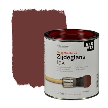 De KARWEI lak zijdeglans bordeaux extra dekkend 750 ml is een stoot- en krasvaste lak. De lak is weersbestendig en is dus geschikt voor zowel binnen als buiten. De lak kan gebruikt worden voor decoratieve toepassingen op zowel hout, metaal als kunststof. De lak op terpentinebasis heeft een optimale dekking en vloeiing. Hierdoor kun je de lak gemakkelijk met een kwast of roller aanbrengen. Het blik bevat 750 milliliter bordeauxkleurige lak, dit is genoeg voor zo'n 12 vierkante meter, ervan uitgaande dat in dunne lagen wordt geschilderd. De zijdeglans lak is in diverse populaire kleuren kant en klaar verkrijgbaar. Zit jou kleur er toch niet bij, dan kun je deze laten mengen in de KARWEI bouwmarkt op de verfmengmachine. Let erop dat lichte kleuren binnenshuis naar verloop van tijd geel kunnen worden, vooral op plaatsen die niet veel in contact komen met daglicht.