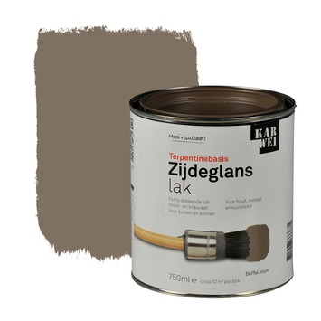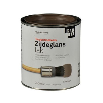 De KARWEI lak zijdeglans buffel bruin extra dekkend 750 ml is een stoot- en krasvaste lak. De lak is weersbestendig en is dus geschikt voor zowel binnen als buiten. De lak kan gebruikt worden voor decoratieve toepassingen op zowel hout, metaal als kunststof. De lak op terpentinebasis heeft een optimale dekking en vloeiing. Hierdoor kun je de lak gemakkelijk met een kwast of roller aanbrengen. Het blik bevat 750 milliliter buffel bruine lak, dit is genoeg voor zo'n 12 vierkante meter, ervan uitgaande dat in dunne lagen wordt geschilderd. De zijdeglans lak is in diverse populaire kleuren kant en klaar verkrijgbaar. Zit jou kleur er toch niet bij, dan kun je deze laten mengen in de KARWEI bouwmarkt op de verfmengmachine. Let erop dat lichte kleuren binnenshuis naar verloop van tijd geel kunnen worden, vooral op plaatsen die niet veel in contact komen met daglicht.