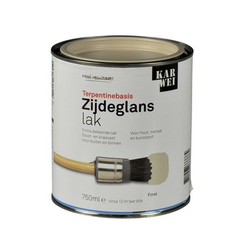 De KARWEI lak zijdeglans forel extra dekkend 750 ml is een stoot- en krasvaste lak. De lak is weersbestendig en is dus geschikt voor zowel binnen als buiten. De lak kan gebruikt worden voor decoratieve toepassingen op zowel hout, metaal als kunststof. De lak op terpentinebasis heeft een optimale dekking en vloeiing. Hierdoor kun je de lak gemakkelijk met een kwast of roller aanbrengen. Het blik bevat 750 milliliter forelkleurige lak, dit is genoeg voor zo'n 12 vierkante meter, ervan uitgaande dat in dunne lagen wordt geschilderd. De zijdeglans lak is in diverse populaire kleuren kant en klaar verkrijgbaar. Zit jou kleur er toch niet bij, dan kun je deze laten mengen in de KARWEI bouwmarkt op de verfmengmachine. Let erop dat lichte kleuren binnenshuis naar verloop van tijd geel kunnen worden, vooral op plaatsen die niet veel in contact komen met daglicht.