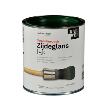 De KARWEI lak zijdeglans jachtgroen extra dekkend 750 ml is een stoot- en krasvaste lak. De lak is weersbestendig en is dus geschikt voor zowel binnen als buiten. De lak kan gebruikt worden voor decoratieve toepassingen op zowel hout, metaal als kunststof. De lak op terpentinebasis heeft een optimale dekking en vloeiing. Hierdoor kun je de lak gemakkelijk met een kwast of roller aanbrengen. Het blik bevat 750 milliliter jachtgroene lak, dit is genoeg voor zo'n 12 vierkante meter, ervan uitgaande dat in dunne lagen wordt geschilderd. De zijdeglans lak is in diverse populaire kleuren kant en klaar verkrijgbaar. Zit jou kleur er toch niet bij, dan kun je deze laten mengen in de KARWEI bouwmarkt op de verfmengmachine. Let erop dat lichte kleuren binnenshuis naar verloop van tijd geel kunnen worden, vooral op plaatsen die niet veel in contact komen met daglicht.