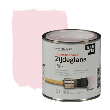 De KARWEI lak zijdeglans suikerhart extra dekkend 250 ml is een stoot- en krasvaste lak. De lak is weersbestendig en is dus geschikt voor zowel binnen als buiten. De lak kan gebruikt worden voor decoratieve toepassingen op zowel hout, metaal als kunststof. De lak op terpentinebasis heeft een optimale dekking en vloeiing. Hierdoor kun je de lak gemakkelijk met een kwast of roller aanbrengen. Het blik bevat 250 milliliter suikerhartkleurige lak, dit is genoeg voor zo'n 4 vierkante meter, ervan uitgaande dat in dunne lagen wordt geschilderd. De zijdeglans lak is in diverse populaire kleuren kant en klaar verkrijgbaar. Zit jou kleur er toch niet bij, dan kun je deze laten mengen in de KARWEI bouwmarkt op de verfmengmachine. Let erop dat lichte kleuren binnenshuis naar verloop van tijd geel kunnen worden, vooral op plaatsen die niet veel in contact komen met daglicht.