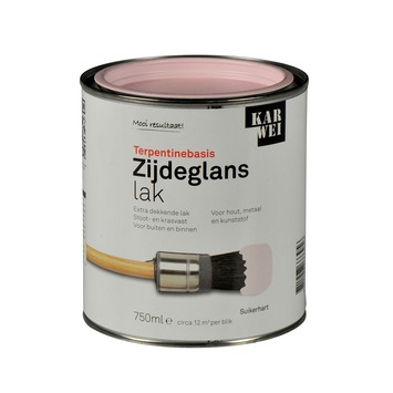 De KARWEI lak zijdeglans suikerhart extra dekkend 750 ml is een stoot- en krasvaste lak. De lak is weersbestendig en is dus geschikt voor zowel binnen als buiten. De lak kan gebruikt worden voor decoratieve toepassingen op zowel hout, metaal als kunststof. De lak op terpentinebasis heeft een optimale dekking en vloeiing. Hierdoor kun je de lak gemakkelijk met een kwast of roller aanbrengen. Het blik bevat 750 milliliter suikerhartkleurige lak, dit is genoeg voor zo'n 12 vierkante meter, ervan uitgaande dat in dunne lagen wordt geschilderd. De zijdeglans lak is in diverse populaire kleuren kant en klaar verkrijgbaar. Zit jou kleur er toch niet bij, dan kun je deze laten mengen in de KARWEI bouwmarkt op de verfmengmachine. Let erop dat lichte kleuren binnenshuis naar verloop van tijd geel kunnen worden, vooral op plaatsen die niet veel in contact komen met daglicht.