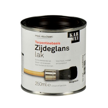 De KARWEI lak zijdeglans wengé bruin extra dekkend 250 ml is een stoot- en krasvaste lak. De lak is weersbestendig en is dus geschikt voor zowel binnen als buiten. De lak kan gebruikt worden voor decoratieve toepassingen op zowel hout, metaal als kunststof. De lak op terpentinebasis heeft een optimale dekking en vloeiing. Hierdoor kun je de lak gemakkelijk met een kwast of roller aanbrengen. Het blik bevat 250 milliliter wengé bruine lak, dit is genoeg voor zo'n 4 vierkante meter, ervan uitgaande dat in dunne lagen wordt geschilderd. De zijdeglans lak is in diverse populaire kleuren kant en klaar verkrijgbaar. Zit jou kleur er toch niet bij, dan kun je deze laten mengen in de KARWEI bouwmarkt op de verfmengmachine. Let erop dat lichte kleuren binnenshuis naar verloop van tijd geel kunnen worden, vooral op plaatsen die niet veel in contact komen met daglicht.