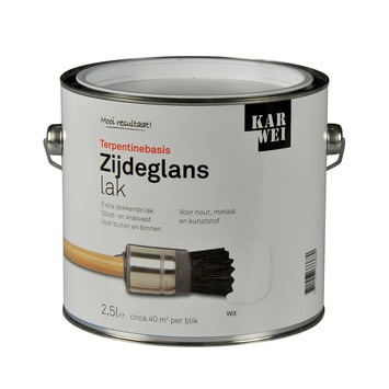 De KARWEI lak zijdeglans wit extra dekkend 2,5 l is een stoot- en krasvaste lak. Het is geschikt voor decoratieve toepassingen binnenshuis op zowel hout, metaal als kunststof. De lak is ook weersbestendig en dus te gebruiken voor toepassingen buitenshuis. De lak op terpentinebasis is gemakkelijk en snel aan te brengen met een kwast of roller en is extra dekkend. Het blik bevat 2,5 liter witte lak, dit is genoeg voor een oppervlakte van zo'n 40 vierkante meter, ervan uitgaande dat in dunne lagen wordt geschilderd. De zijdeglans lak is in diverse populaire kleuren kant en klaar verkrijgbaar. Zit jou kleur er toch niet bij, dan kun je deze laten mengen in de KARWEI bouwmarkt op de verfmengmachine. Let erop dat lichte kleuren binnenshuis naar verloop van tijd geel kunnen worden, vooral op plaatsen die niet veel in contact komen met daglicht.