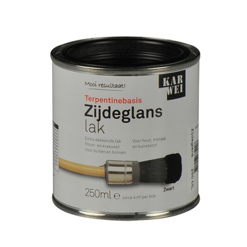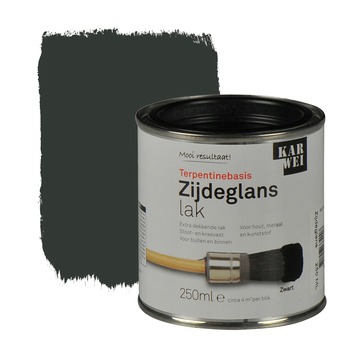 De KARWEI lak zijdeglans zwart extra dekkend 250 ml is een stoot- en krasvaste lak. De lak is weersbestendig en is dus geschikt voor zowel binnen als buiten. De lak kan gebruikt worden voor decoratieve toepassingen op zowel hout, metaal als kunststof. De lak op terpentinebasis heeft een optimale dekking en vloeiing. Hierdoor kun je de lak gemakkelijk met een kwast of roller aanbrengen. Het blik bevat 250 milliliter zwarte lak, dit is genoeg voor zo'n 4 vierkante meter, ervan uitgaande dat in dunne lagen wordt geschilderd. De zijdeglans lak is in diverse populaire kleuren kant en klaar verkrijgbaar. Zit jou kleur er toch niet bij, dan kun je deze laten mengen in de KARWEI bouwmarkt op de verfmengmachine. Let erop dat lichte kleuren binnenshuis naar verloop van tijd geel kunnen worden, vooral op plaatsen die niet veel in contact komen met daglicht.