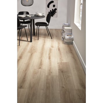 Verrijk je leefruimte met de natuurlijke schoonheid en moderne flair van Karwei's laminaat Easy Living Rustig bruin eiken. De vloer creëert een verfijnde uitstraling voor je woning die lang mee zal gaan. Aan alle zijden van de laminaatplank met voelbare houtstructuur bevinden zich V-groeven, waardoor deze de authentieke look krijgt van een echte houten plank. Met de klikverbinding leg je de laminaatvloer eenvoudig en naadloos zwevend, omdat deze niet op de ondervloer hoeft te worden verlijmd. De laminaatvloer is in combinatie met de juiste ondervloer prima geschikt voor eventuele vloerverwarming aan de hand van warmwaterbuizen. Het gebruik van HDF (High Density Fiberboard) als basismateriaal maakt dat het product PEFC gecertificeerd is, wat betekent dat het hout afkomstig is uit duurzaam beheerde bossen. Laminaat is bovendien makkelijk te reinigen en daarmee zeer onderhoudsvriendelijk. De laminaatvloer heeft een dikte van 8 mm, wat bijdraagt aan een goede stabiliteit en het product geschikt maakt voor zowel intensief woongebruik als normaal commercieel gebruik. De verpakking bevat 8 lamellen wat resulteert in een totale inhoud van 2.69 m².