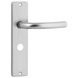 Deurkruk. Type Linea mat verchroomd, op langschild voor wc, toilet of badkamer 63mm met stift 8mm. De deurklink is vast gemonteerd op het schild en is voorzien van een veer waardoor de kruk niet gaat hangen. In deze serie is ook een blind schild en sleutel 56mm beschikbaar. Het is mogelijk om in de bouwmarkt afwijkende WC, sleutel en cilindermaten te bestellen.