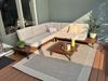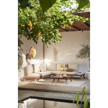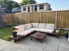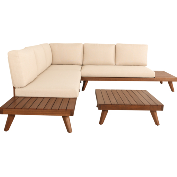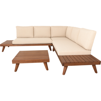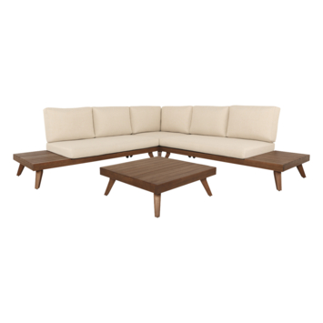 - Set bestaat uit een hoekloungebank met zijtafels, bijzettafel en zit- en rugkussens