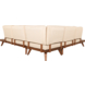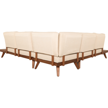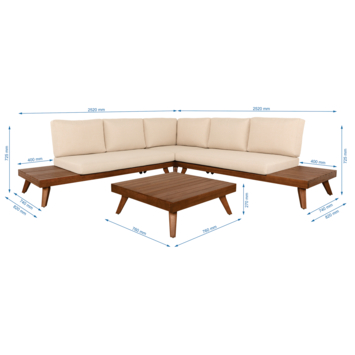 Maak van je tuin of terras een stijlvolle en comfortabele ruimte met de loungeset Bordeaux. Deze houten loungeset in walnutkleur is ontworpen met oog voor detail en biedt ruimte aan vijf personen, perfect voor gezellige avonden of ontspannen ochtenden. De set bestaat uit een hoekloungebank met zijtabletten, een praktische bijzettafel en comfortabele zit- en rugkussens. Het eucalyptushouten frame zorgt voor een natuurlijke, warme uitstraling en is sterk, zodat je jarenlang van deze set kunt genieten. De inbegrepen beige kussens bieden optimaal comfort, met een aangename dikte voor zowel de rugkussens als de zitkussens. Of je nu geniet van een drankje met vrienden of lekker een boek leest, deze set zorgt voor het ultieme zitgemak. Dankzij het elegante ontwerp past de loungeset Bordeaux bij iedere stijl, van modern tot klassiek. Je kunt de set perfect combineren met een groot buitenkleed en sfeerverlichting om jouw buitenruimte helemaal af te maken. Om de kwaliteit te behouden, is het aan te raden de set bij slecht weer of in de winter op een droge plek op te bergen.