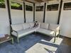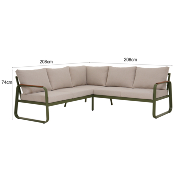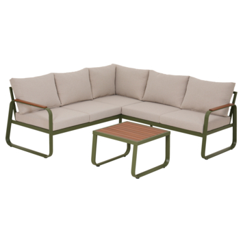 Met de KARWEI loungeset Elise haal je een elegante en comfortabele zitplek in huis. Deze groene loungebank, geschikt voor 4 personen, heeft een modern design en biedt met de beige kussens veel comfort. De set bestaat uit een loungebank van 74 cm hoog, 203 cm breed en 203 cm diep, met een bijpassende salontafel. De 20 cm dikke rugkussens en de 10 cm dikke zitkussens zorgen voor ultiem zitcomfort, perfect voor lange zomerdagen in je tuin. Het metalen frame van de loungeset is sterk en biedt een betrouwbare basis voor jarenlang gebruik. De beige kussens brengen een warme uitstraling die goed past bij het groene frame. De salontafel voegt extra functionaliteit toe, ideaal om je drankjes of boeken neer te zetten. Om je loungeset in topconditie te houden, adviseren we om de kussens bij slecht weer op te bergen of af te dekken, zodat ze lang mooi blijven.