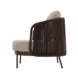De rugleuning is bekleed met bruine stof op een stevig bruin metalen frame, wat zorgt voor een warme en luxe uitstraling. De meegeleverde zit- en rugkussens bieden extra ondersteuning en comfort, zodat je optimaal kunt genieten van je buitenruimte.