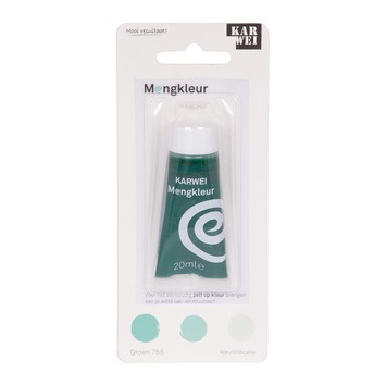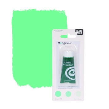 De KARWEI mengkleur groen 20 ml is een sterk geconcentreerde universele kleurstof. De mengkleur is geschikt voor het aankleuren van witte lakverf, muurverf of sierpleister. Je kunt met deze mengkleur helemaal zelf je eigen unieke kleur verf creëren. Zorg ervoor dat je voldoende verf in één keer mengt, aangezien het lastig is om exact dezelfde kleur nogmaals te mengen. De maximale toevoeging mengkleur aan de verf is 5 procent. De tube bevat 20 milliliter groene mengkleur.