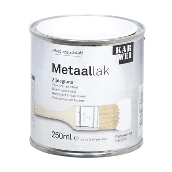De KARWEI metaallak zijdeglans wit (RAL 9010) 250 ml is een grondverf en metaallak in één. De licht glanzende lak is geschikt voor ijzer, staal en andere metalen. Een voorbehandeling met een primer is niet nodig. Het heeft een roestwerende werking met een uitstekende hechting en geeft een langdurige bescherming aan alle metalen binnen- en buitenshuis. Het blik bevat 250 milliliter witte lak, dit is genoeg voor een oppervlakte van zo'n 3 vierkante meter. De KARWEI metaalverf is kant en klaar te verkrijgen in diverse kleuren en in nog veel meer kleuren in de KARWEI bouwmarkt op de verfmengmachine.