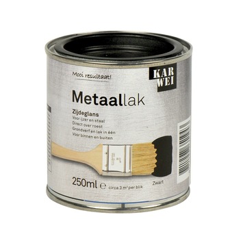 De KARWEI metaallak zijdeglans zwart 250 ml is een grondverf en metaallak in één. De licht glanzende lak is geschikt voor ijzer, staal en andere metalen. Een voorbehandeling met een primer is niet nodig. Het heeft een roestwerende werking met een uitstekende hechting en geeft een langdurige bescherming aan alle metalen binnen- en buitenshuis. Het blik bevat 250 milliliter zwarte lak, dit is genoeg voor een oppervlakte van zo'n 3 vierkante meter. De KARWEI metaalverf is kant en klaar te verkrijgen in diverse kleuren en in nog veel meer kleuren in de KARWEI bouwmarkt op de verfmengmachine.