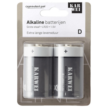 KARWEI batterij D, een krachtige 1,5 volt monocel alkaline batterij met een extra lange levensduur. Verpakking: 2 stuks.