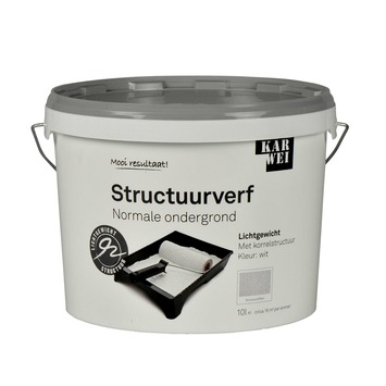 De KARWEI muur- en plafond structuurverf mat wit 10 l is een goed dekkende, stootvaste structuurverf met fijne kwartskorrels. De verf weegt 30 procent minder dan een normale structuurverf en is daardoor gemakkelijker verwerkbaar. Het is toe te passen als decoratieve, stootvaste afwerklaag op muren en plafonds in woon- en slaapkamer, hal, keuken en dergelijke. De structuurverf heeft een matte afwerking en is eenvoudig aan te brengen met een muurverfroller. De emmer bevat 10 liter witte verf, dit is genoeg voor een oppervlakte van zo'n 16 vierkante meter. De muur- en plafond structuurverf is ook verkrijgbaar in diverse andere lichte kleuren in de KARWEI bouwmarkt op de verfmengmachine.