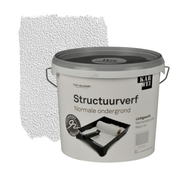De KARWEI muur- en plafond structuurverf mat wit 5 l is een goed dekkende, stootvaste structuurverf met fijne kwartskorrels. De verf weegt 30 procent minder dan een normale structuurverf en is daardoor gemakkelijker verwerkbaar. Het is toe te passen als decoratieve, stootvaste afwerklaag op muren en plafonds in woon- en slaapkamer, hal, keuken en dergelijke. De structuurverf heeft een matte afwerking en is eenvoudig aan te brengen met een muurverfroller. De emmer bevat 5 liter witte verf, dit is genoeg voor een oppervlakte van zo'n 8 vierkante meter. De muur- en plafond structuurverf is ook verkrijgbaar in diverse andere lichte kleuren in de KARWEI bouwmarkt op de verfmengmachine.