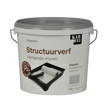 De KARWEI muur- en plafond structuurverf werkende muren wit 5 kg is een hoogwaardige, blijvend elastische verf. goed dekkende pastavormende structuurverf. De verf voorkomt het ontstaan van haarscheurtjes in muren en plafonds en vult kleine haarscheurtjes van maximaal 0,3 mm definitief op. De verf wit van kleur, heeft een matte afwerking en is gemakkelijk overschilderbaar met gewone muurverf. De structuurverf heeft een fijne korrelstructuur en is eenvoudig aan te brengen met een muurverfroller. De emmer bevat 10 kilogram, dit is genoeg voor een oppervlakte van zo'n 6 vierkante meter.