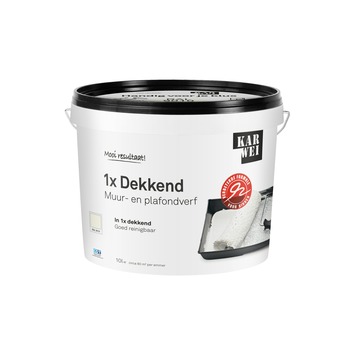 De KARWEI muur- en plafondverf 1x dekkend mat RAL 9010 10 l is een dekkende matte muurverf. Afhankelijk van de kwaliteit en de kleur van de ondergrond dekt deze verf al in één laag. De muur- en plafondverf is geschikt voor het schilderen van alle droge vertrekken binnenshuis, zoals woon-, slaapkamer, hal en dergelijke. De gebroken witte verf heeft een matte afwerking en is zeer goed reinigbaar. De emmer bevat 10 liter verf, dit is genoeg voor een oppervlakte van zo'n 80 vierkante meter. Gebruik voor het schilderen een vachtroller. De verf is in iedere gewenste kleur tegen meerprijs verkrijgbaar in de KARWEI bouwmarkt op de verfmengmachine.