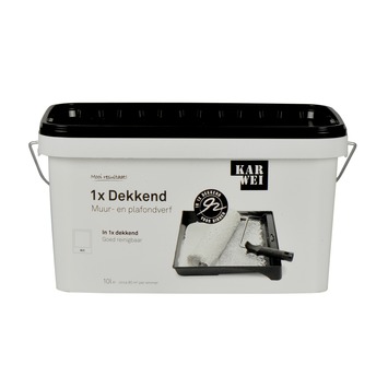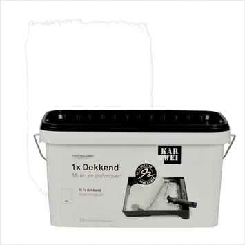 De KARWEI muur- en plafondverf 1x dekkend mat wit 10 l is een dekkende matte muurverf. Afhankelijk van de kwaliteit en de kleur van de ondergrond dekt deze verf al in één laag. De muur- en plafondverf is geschikt voor het schilderen van alle droge vertrekken binnenshuis, zoals woon-, slaapkamer, hal en dergelijke. De witte verf heeft een matte afwerking en is zeer goed reinigbaar. De verf voldoet op het gebied van dekking, witheid en reinigbaarheid aan de norm 82. 00 van het onafhankelijke keuringsinstituut COT. De emmer bevat 10 liter verf, dit is genoeg voor een oppervlakte van zo'n 80 vierkante meter. De verpakking van de verf is een rechthoekige bak, plaats hier een rekje op en je kunt direct uit de verpakking schilderen. Gebruik voor het schilderen een vachtroller. De verf is in iedere gewenste kleur tegen meerprijs verkrijgbaar in de KARWEI bouwmarkt op de verfmengmachine.