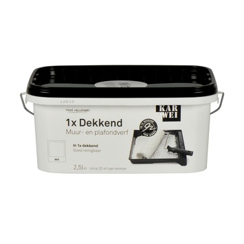 De KARWEI muur- en plafondverf 1x dekkend mat wit 2,5 l is een dekkende matte muurverf. Afhankelijk van de kwaliteit en de kleur van de ondergrond dekt deze verf al in één laag. De muur- en plafondverf is geschikt voor het schilderen van alle droge vertrekken binnenshuis, zoals woon-, slaapkamer, hal en dergelijke. De witte verf heeft een matte afwerking en is zeer goed reinigbaar. De verf voldoet op het gebied van dekking, witheid en reinigbaarheid aan de norm 82. 00 van het onafhankelijke keuringsinstituut COT. De emmer bevat 2,5 liter verf, dit is genoeg voor een oppervlakte van zo'n 20 vierkante meter. De verpakking van de verf is een rechthoekige bak, plaats hier een rekje op en je kunt direct uit de verpakking schilderen. Gebruik voor het schilderen een vachtroller. De verf is in iedere gewenste kleur tegen meerprijs verkrijgbaar in de KARWEI bouwmarkt op de verfmengmachine.
